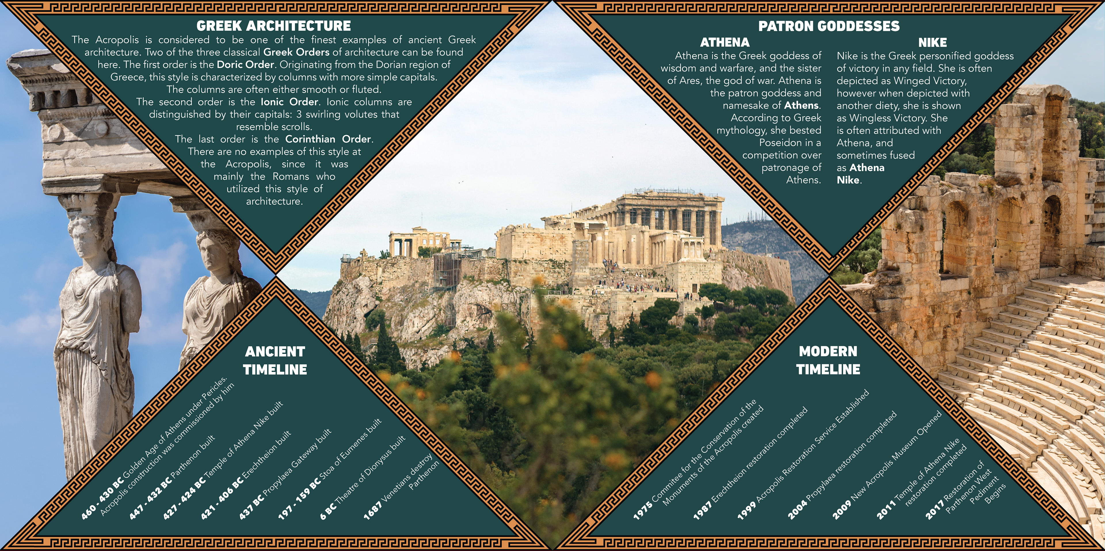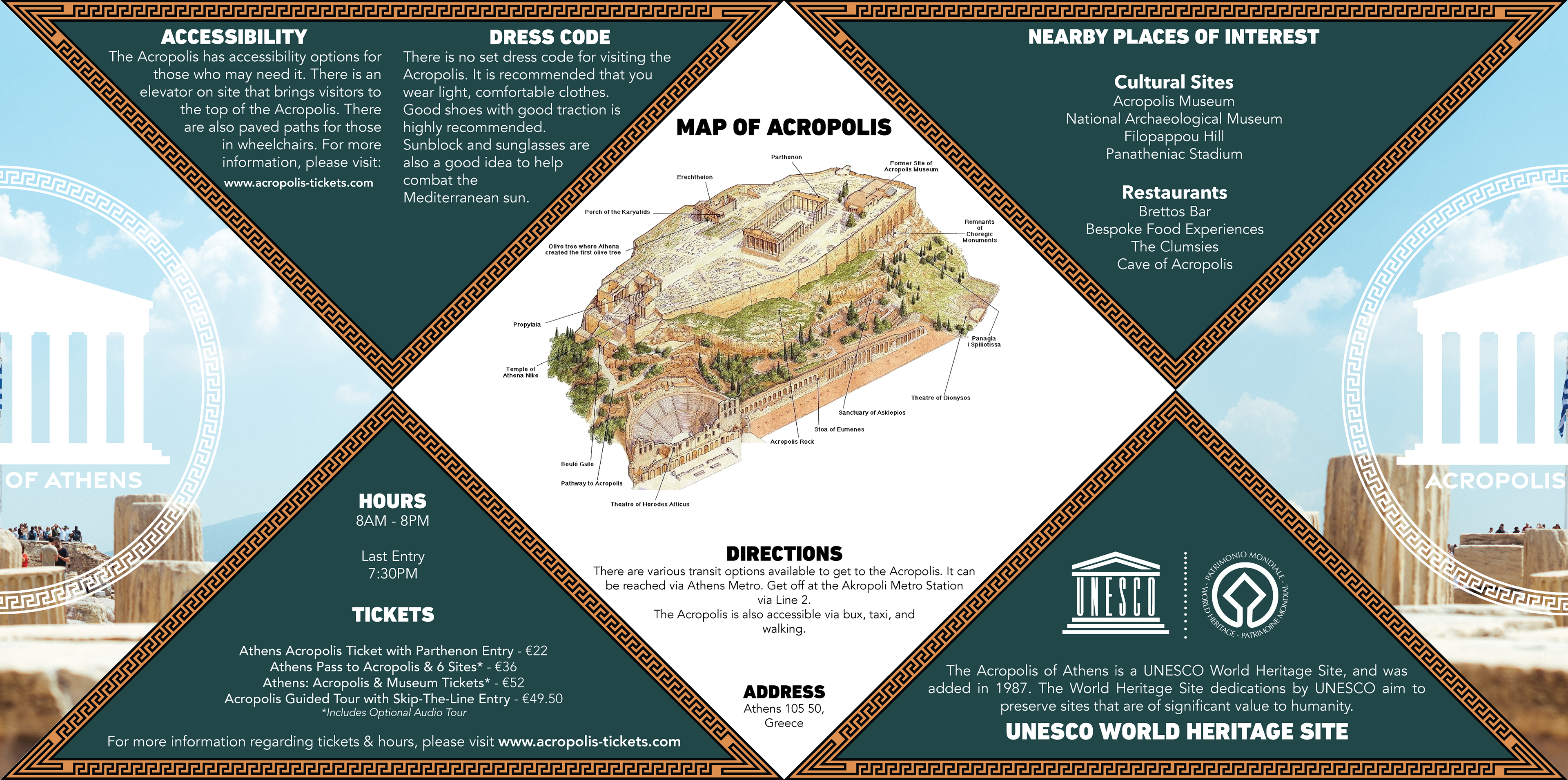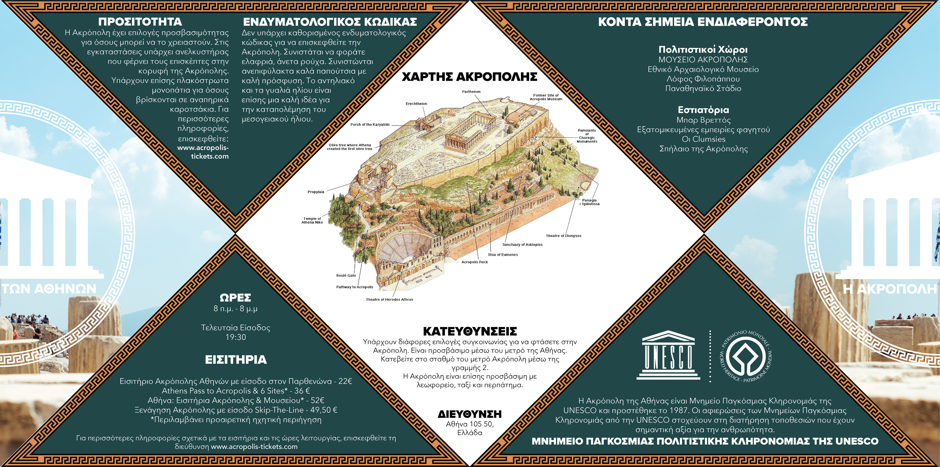 This brochure design is for the famous Acropolis found in Athens, Greece. The brochure follows a unique complex fold that sets it apart from other historical site brochures. It details various information such as ticket prices and a brief history of the Acropolis. This brochure comes in two versions: one in English and one in Greek.