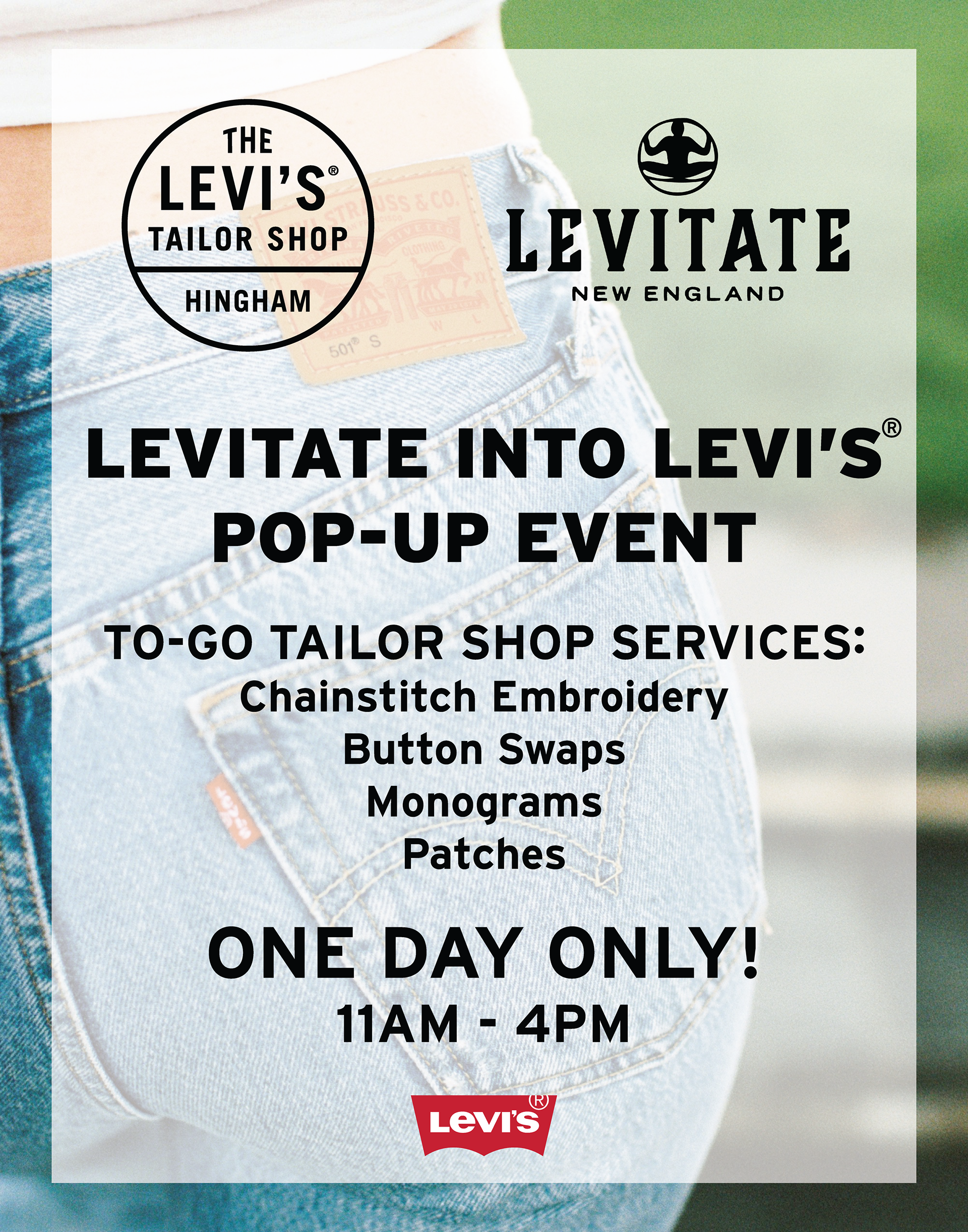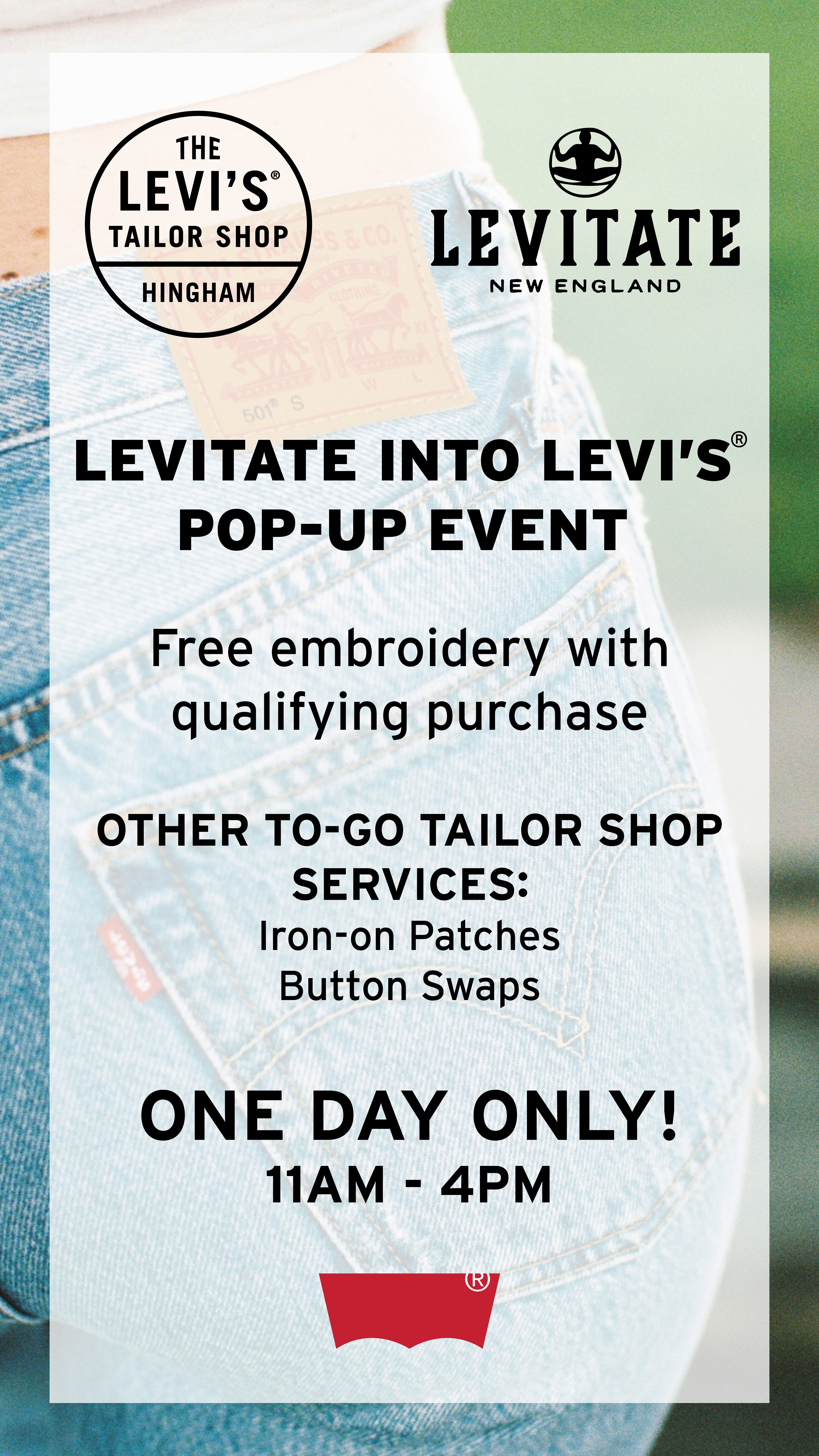 The Levi's® Tailor Shop in Hingham MA’s Derby Street approached Levitate New England in a brand collaboration for promotional social media and print signage. Working in collaboration with Derby Street Shoppe’s marketing team, I created the Instagram story asset to for them to post, meeting their requirements. Taking this opportunity, I had access to the Levi's® Brand Book, studying it to best design these pieces within Levi's® standards. I arranged each design element to be easily legible and informative, creating a balanced marketing piece. Using specific photography to subtly adhere to Levi’s® brand image allowed me to integrate Levitate's signature laid back design.